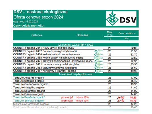 Przedstawiamy Państwu cennik detaliczny na nasiona ekologiczne mieszanek traw i innych gatunków roślin rolniczych.