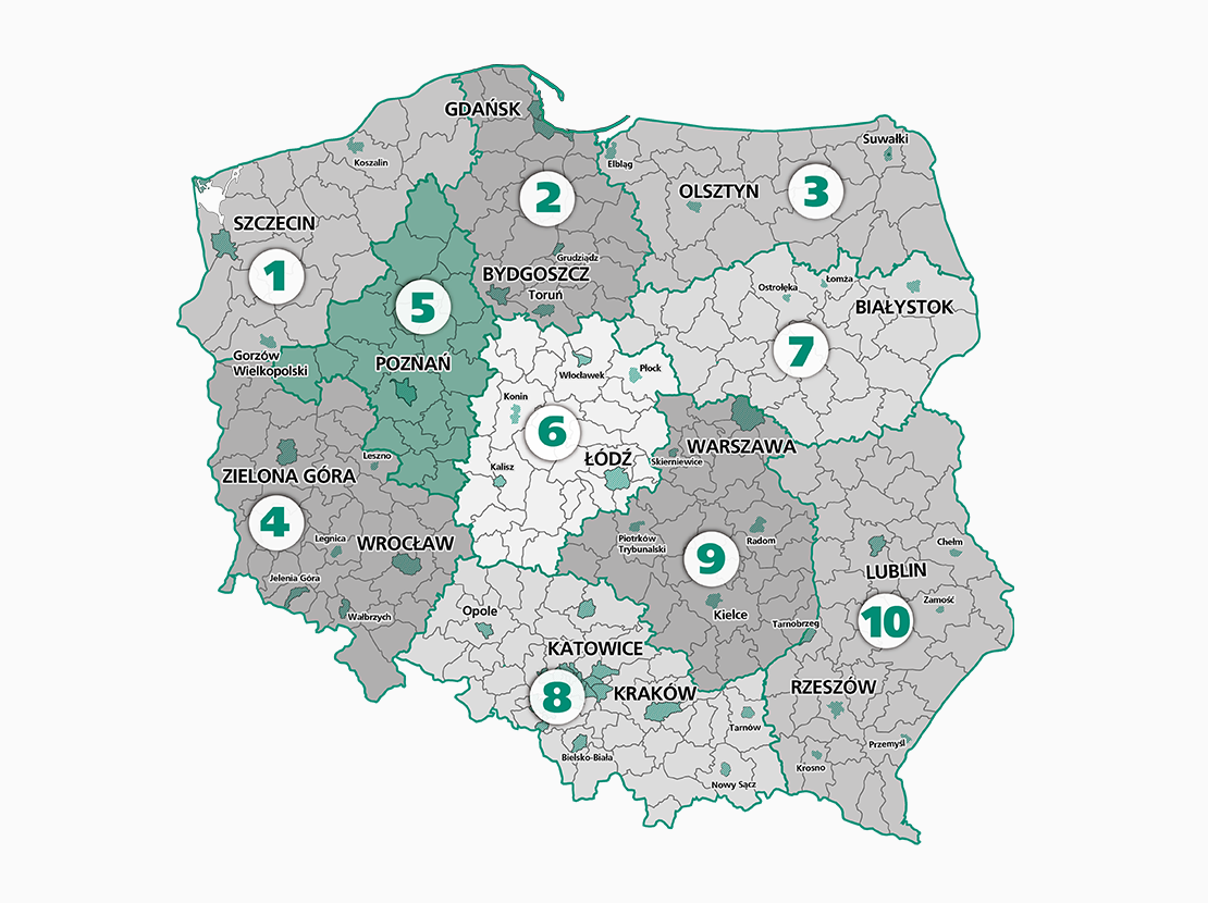 chodzieski, czarnkowsko-trzcianecki, człuchowski, gnieźnieński, gostyński, jarociński, kościański, krotoszyński, międzychodzki, międzyrzecki, nakielski, obornicki, pilski, poznański, sępoleński, szamotulski, śremski, średzki (woj. wielkopolskie), wągrowiecki, wrzesiński, złotowski, żniński,